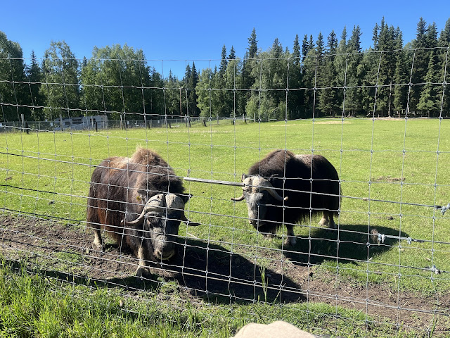 This morning we first go to the Large Animal Research Farm to see Musk Ox, Reindeer and Wood Bison. They currently do not have any Caribou. Reindeer are related to Caribou, but are not native to Alaska. They were brought from Europe for a food source for the native Alaskans since some of their traditional food sources were decimated, seals, Caribou, Bison etc.